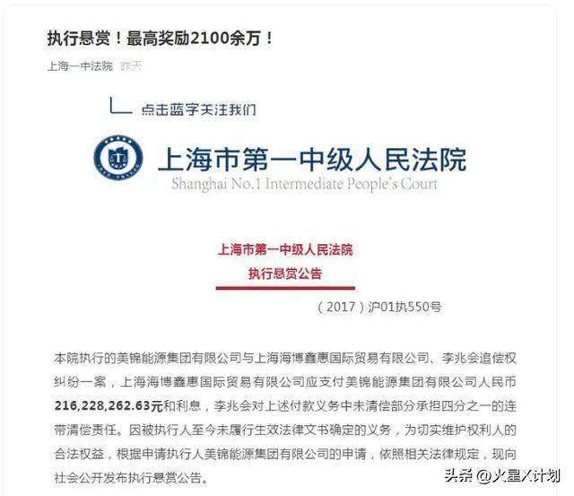 2021年9月15日,上海市第一中级人民法院发布了一则悬赏公告,提供真实有效且法院尚未掌握的李兆会名下的财产线索,举报人最高可获得2160万元的奖赏。